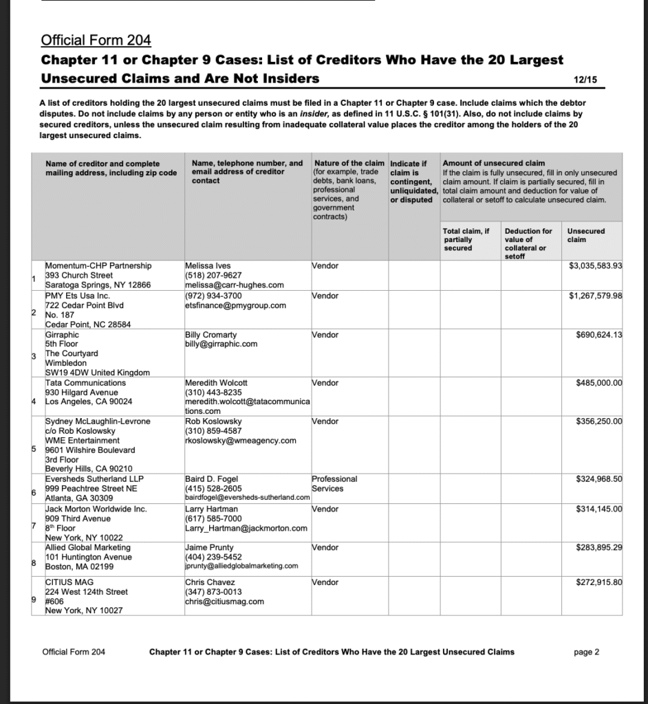 De grootste schuldeiser is televisieproductiebedrijf Momentum CHP Partnership, dat $3,35 miljoen tegoed heeft en andere grote schuldeisers zijn PMY Group voor technologie en live evenementen diensten met $1,26 miljoen en Girraphic voor grafische vormgeving met $690.624.