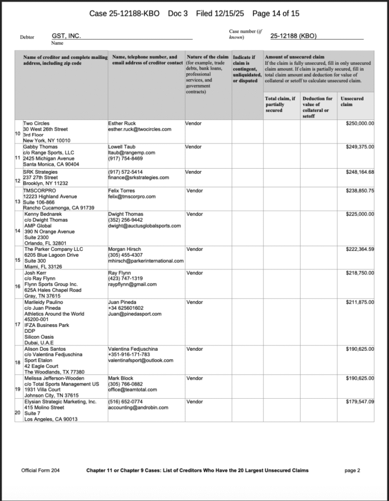 Op 11 december 2025 vroeg GST faillissementsbescherming aan onder Chapter 11 in Delaware en de huidige stand van zaken in de atletiek de atletiek maakt een uitdagende periode van hervorming door, waarbij nieuwe organisaties zoals GST proberen de sport naar een meer commerciële toekomst te stuwen, vergelijkbaar met modellen die in andere grote sporten worden gezien.