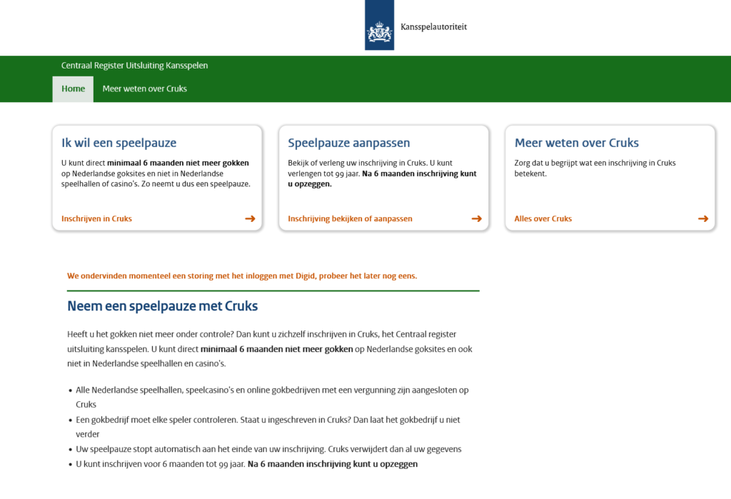 KSA De Nederlandse kansspeltoezichthouder de Kansspelautoriteit (KSA) zei dat een storing met DigiD, een vorm van online ID in het land, betekende dat het momenteel niet mogelijk is om zich te registreren bij Cruks of voor een speler om zijn registratie te wijzigen.
