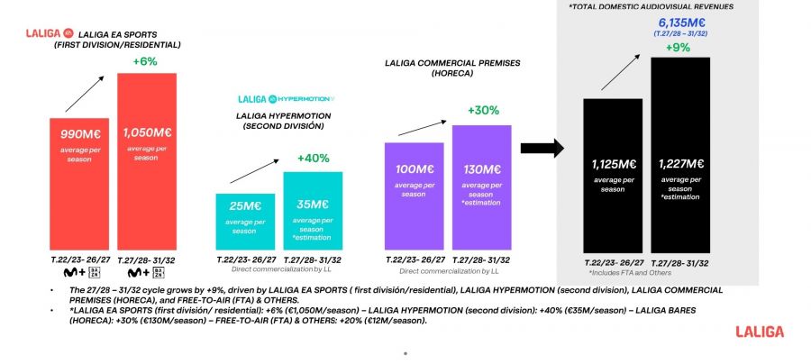 La Liga HYPERMOTION tweede divisie rechten zijn ook gestegen met 40% tot € 175m, met free-to-air en hoogtepunten bijdragen een verdere € 60m.